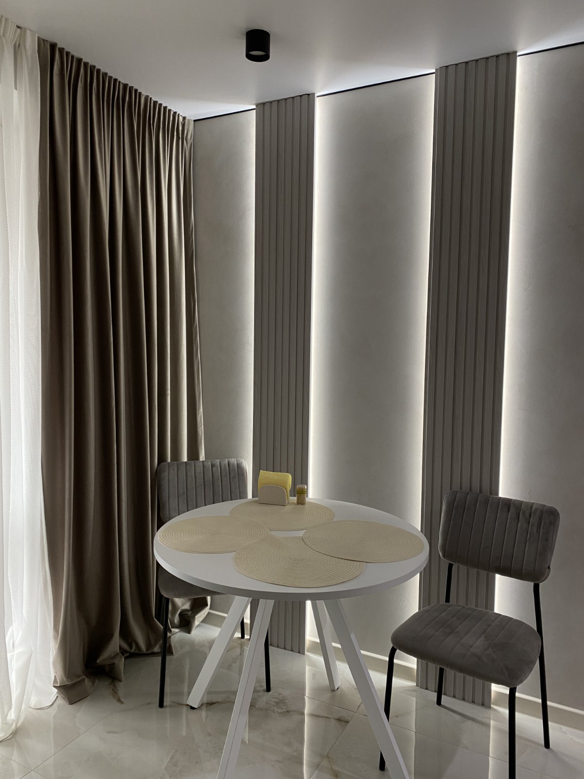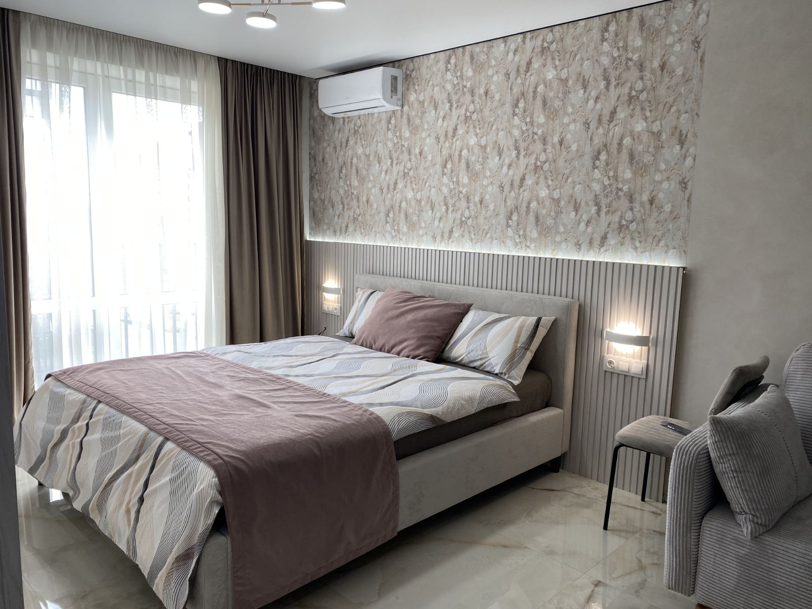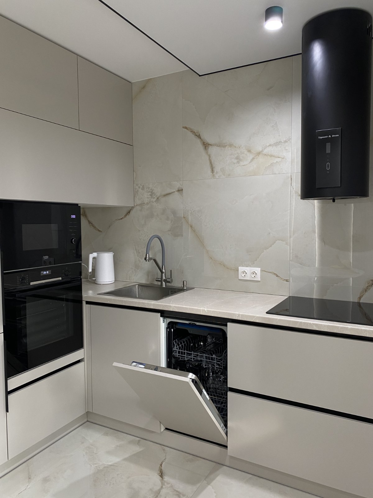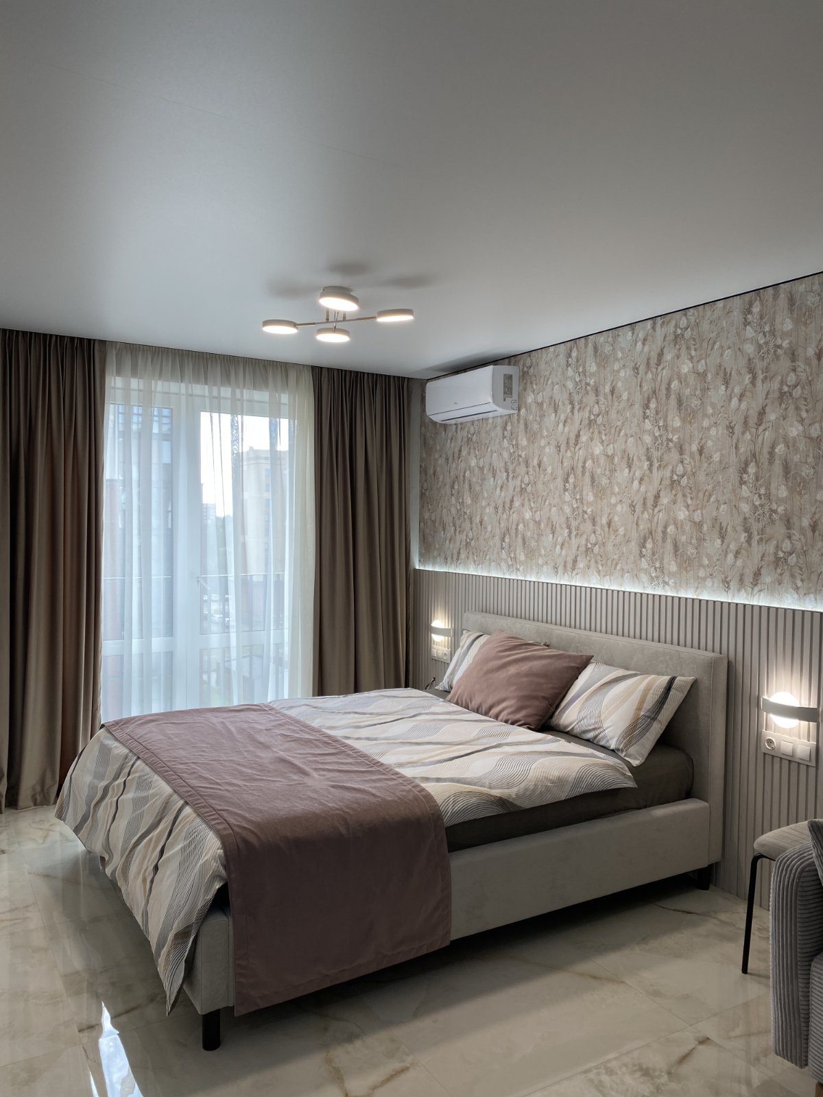 Новая квартира с дизайнерским ремонтом и всем необходимым для комфортного пребывания. В квартире есть двуспальная кровать , с всегда чистым постельным бельём , раскладной диван с размером спального места1.6м.2.0м., комплект чистых полотенец, микроволновая печь, духовой шкаф, вытяжка, чайник, индукционная плита, столовые приборы, штопор, вся необходимая посуда, бокалы, кондиционер, чай , кофе, моющие средства, шампунь, утюг, фен, стиральная машина, бойлер.