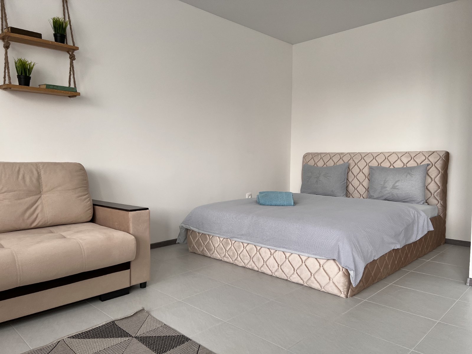 В апартаментах одна двуспальная кровать и двуспальный диван. Вся мебель новая. На кроватях застелено свежее постельное белье. Каждому гостю предоставляется банное полотенце.