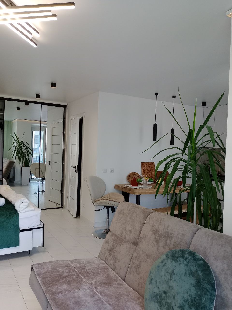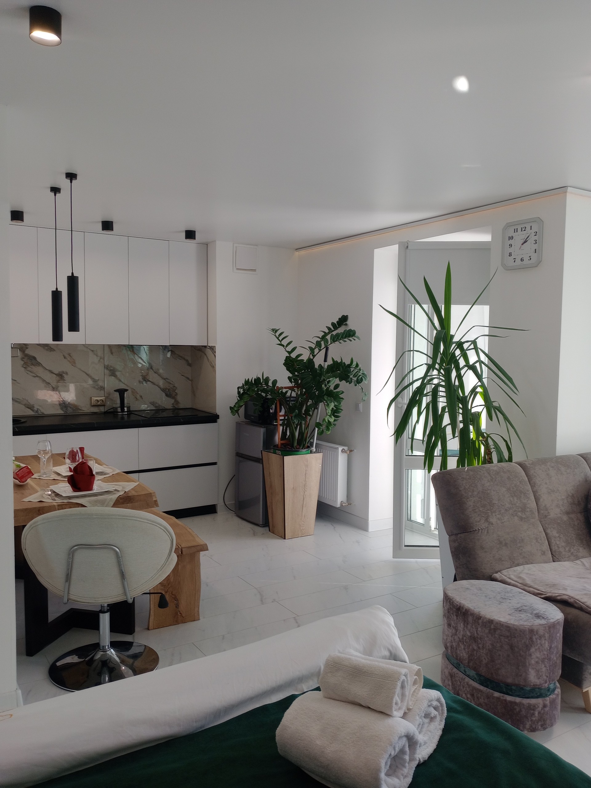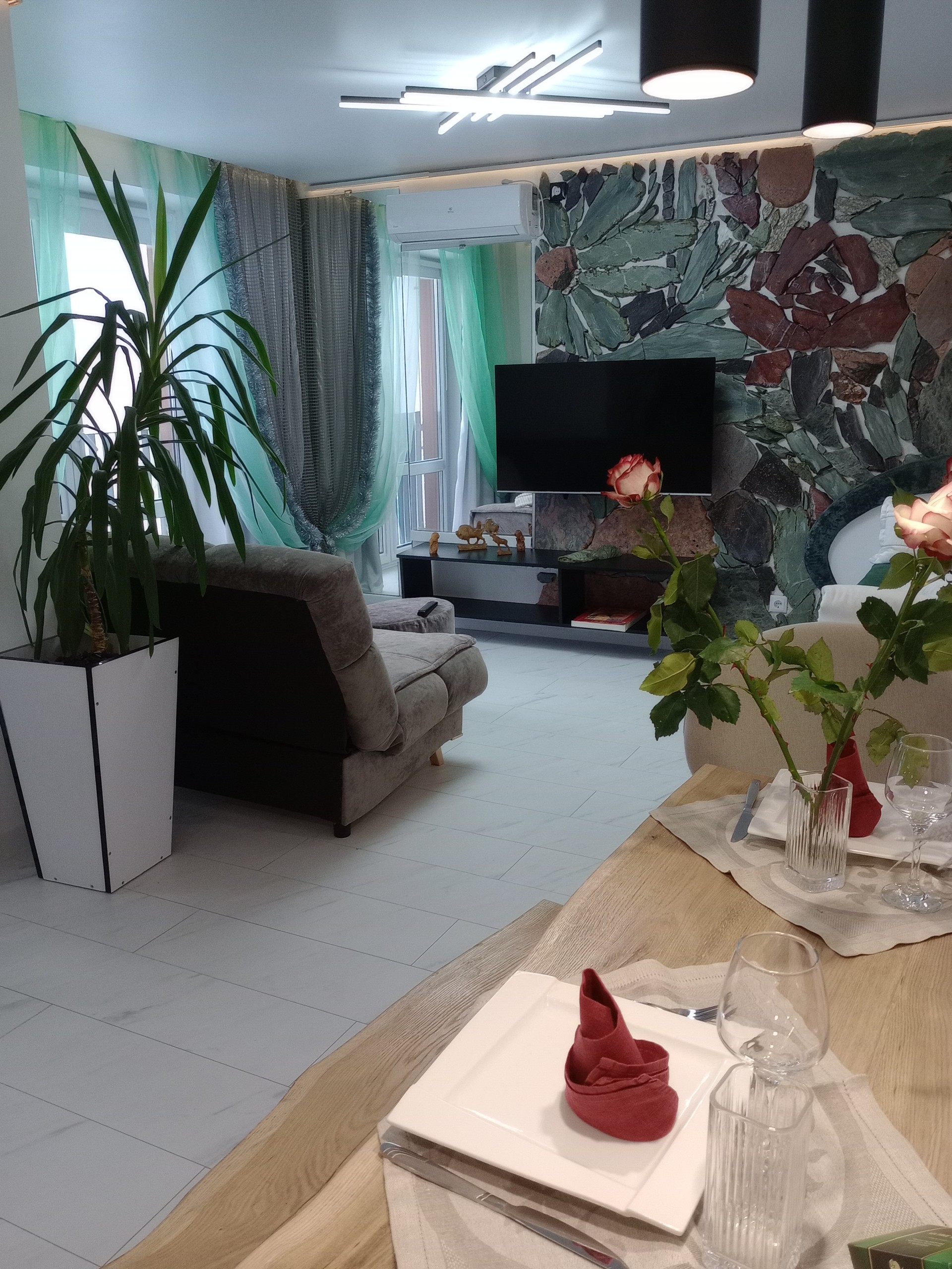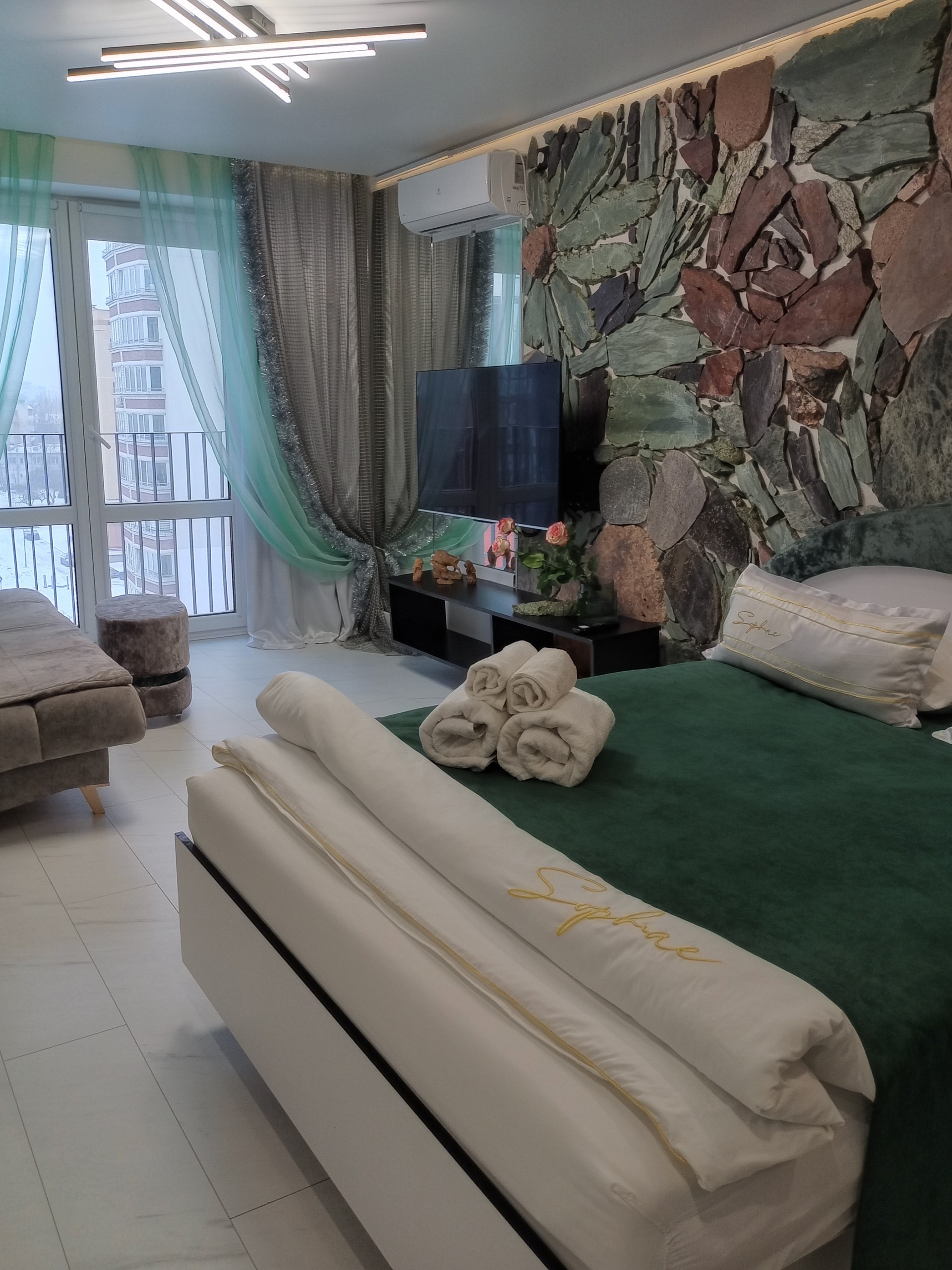Студия в новостройке с 8 этажа открывает вид на красивейшую часть города, в интерьере использован натуральный камен, натуральный дуб. Для Вашего комфорта оборудована большая ( 1,7 м ) угловая джакузи с душем и гидромассажем.