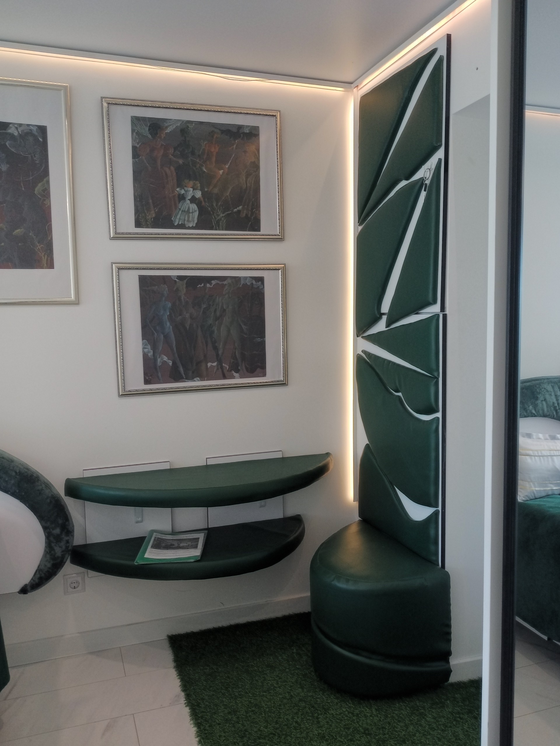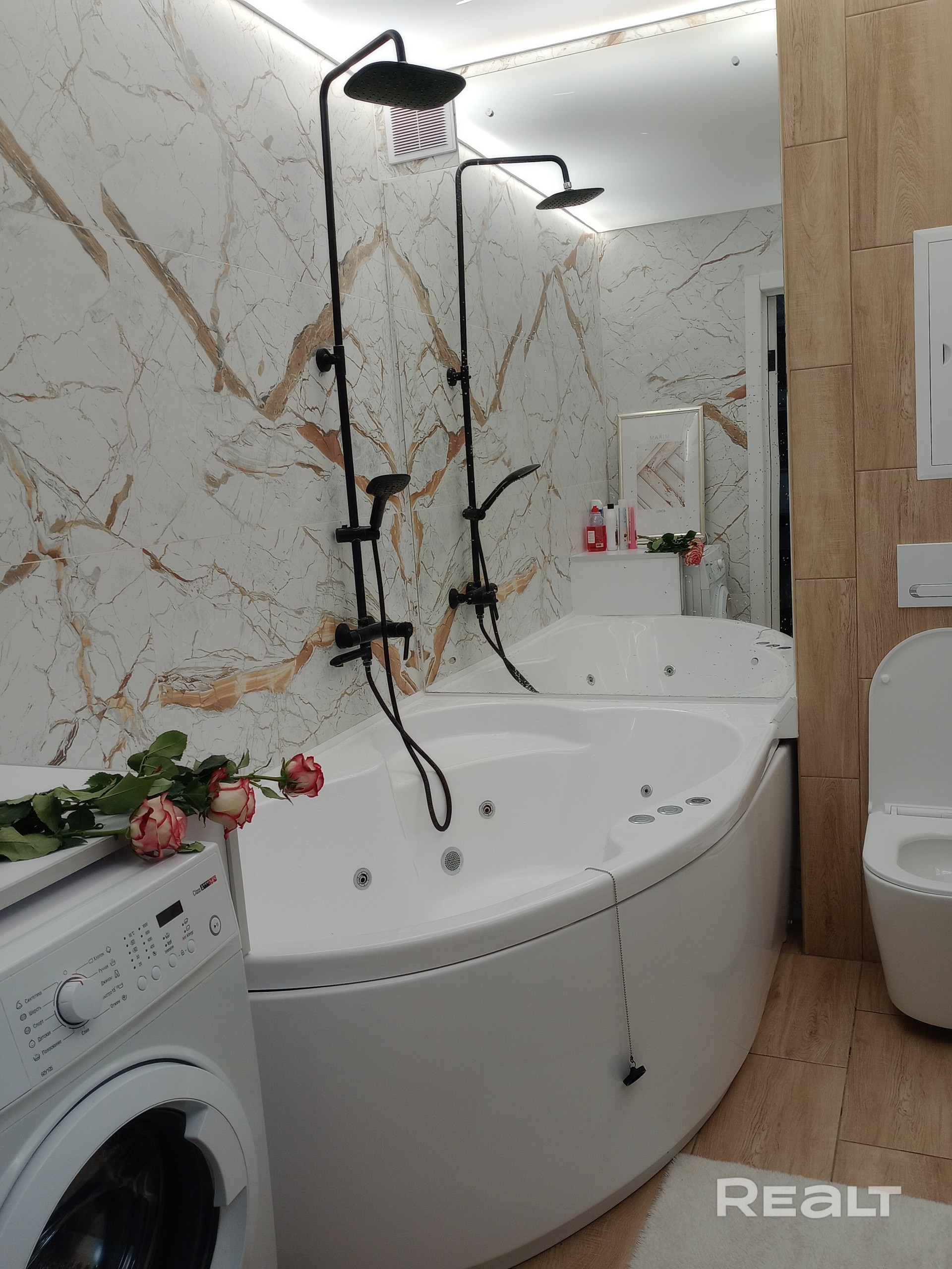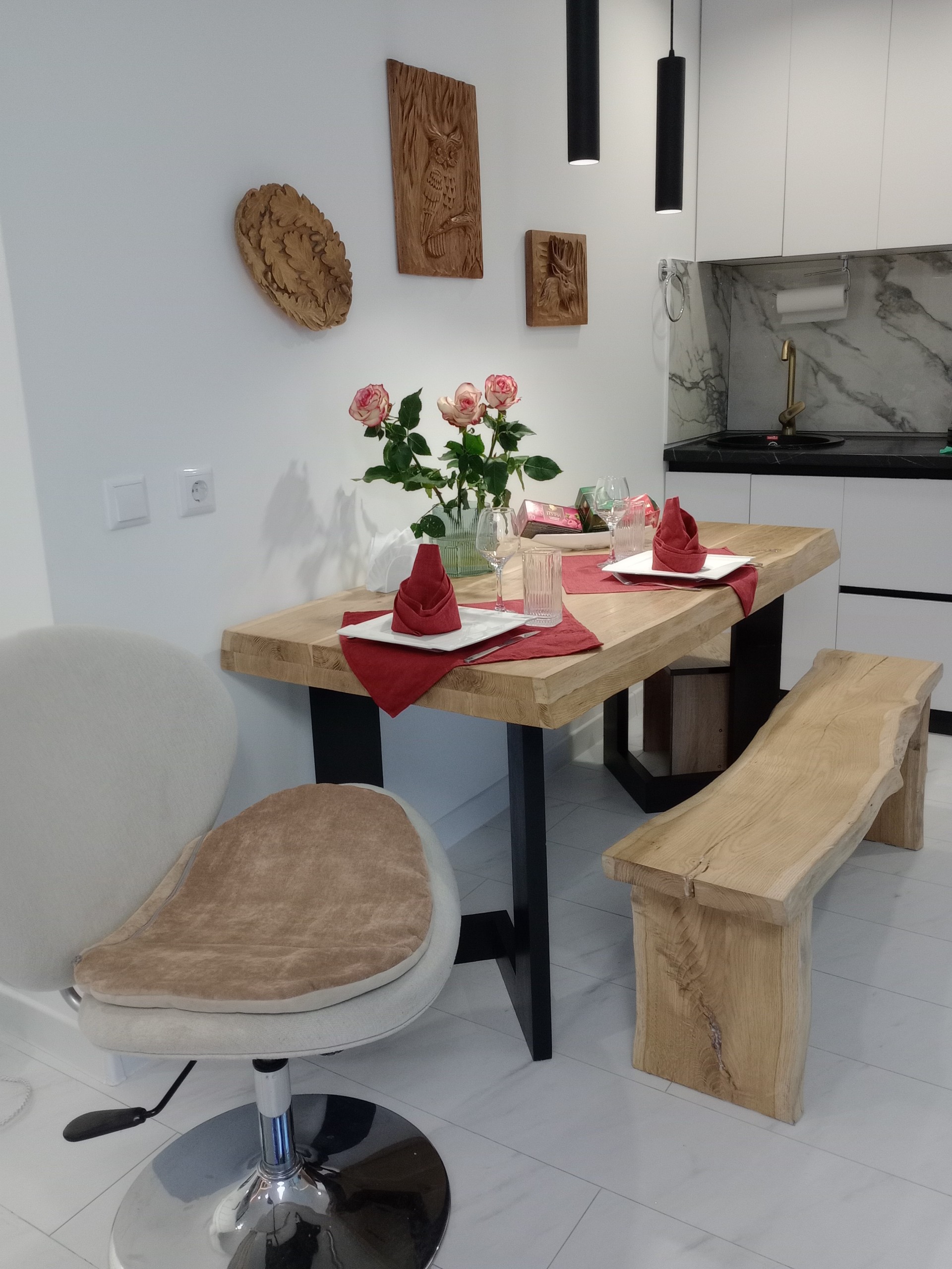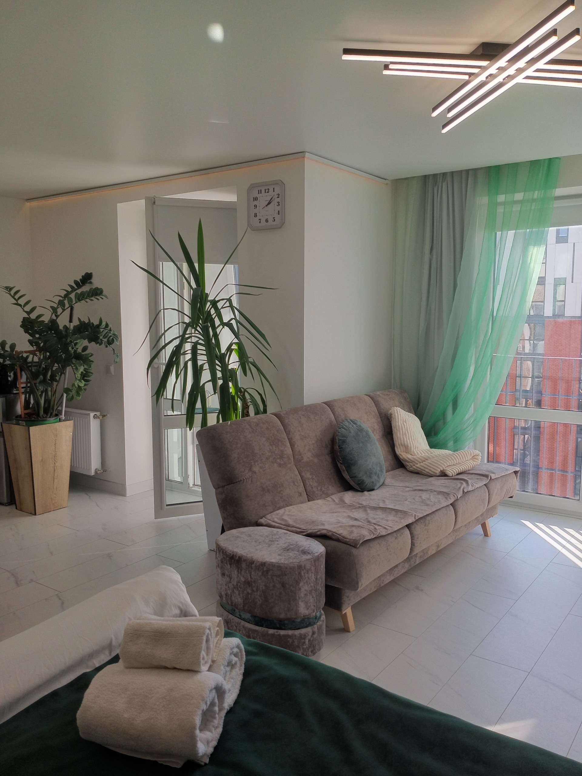 Студия в новостройке с 8 этажа открывает вид на красивейшую часть города, в интерьере использован натуральный камен, натуральный дуб. Для Вашего комфорта оборудована большая ( 1,7 м ) угловая джакузи с душем и гидромассажем.