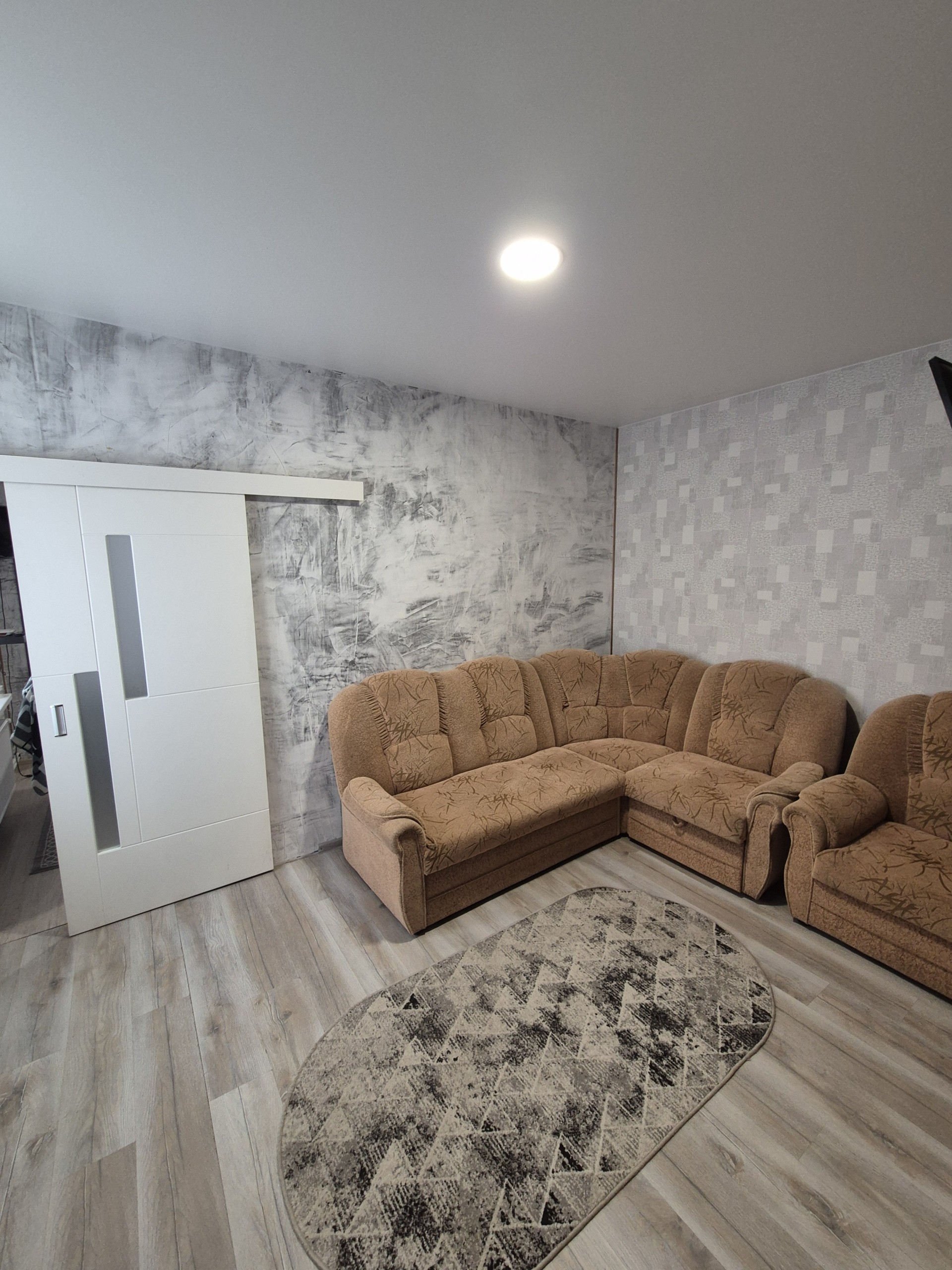 Из мебели кухня, диван, шкаф купе, 2 навесные, стулья стол.