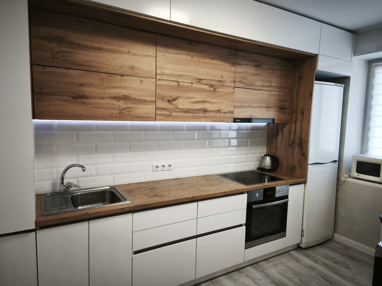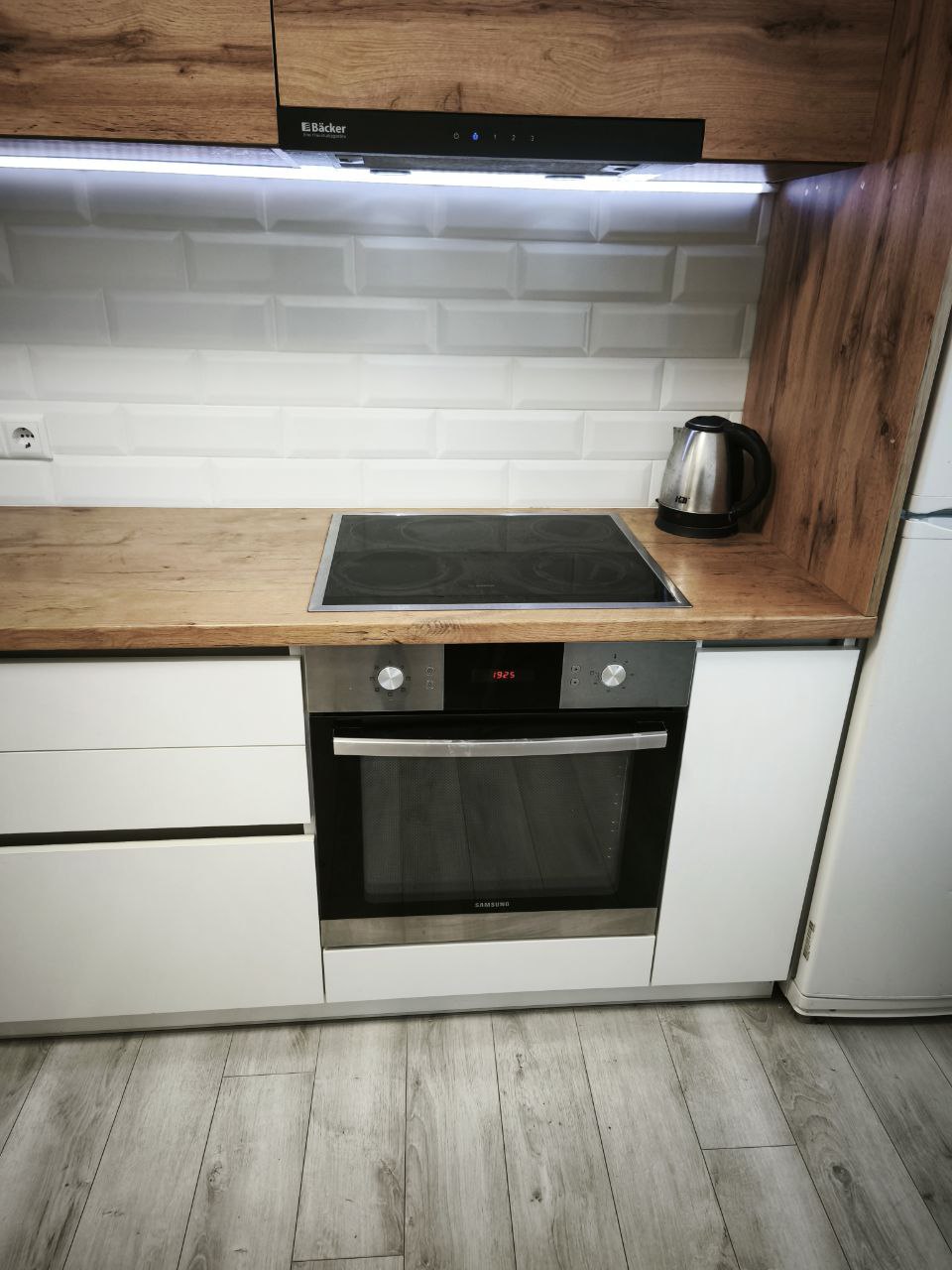 Кухня идет с полным набором техники и посуды :холодильник .варочная поверхность ,духовой шкаф ,микроволновая печь, электрический чайник ,посуда в достаточном количестве.В наличии всегда несколько видов чая и кофе,соль,сахар и специи.