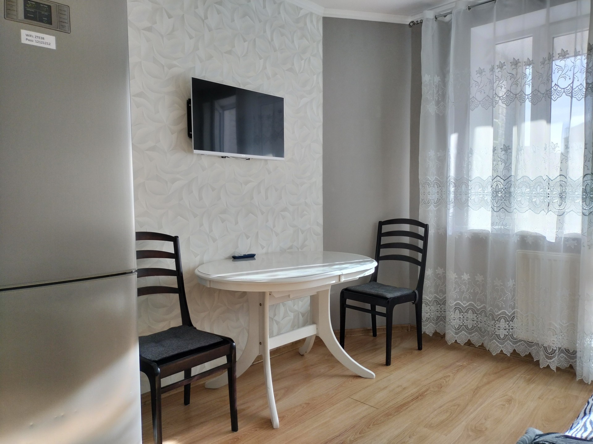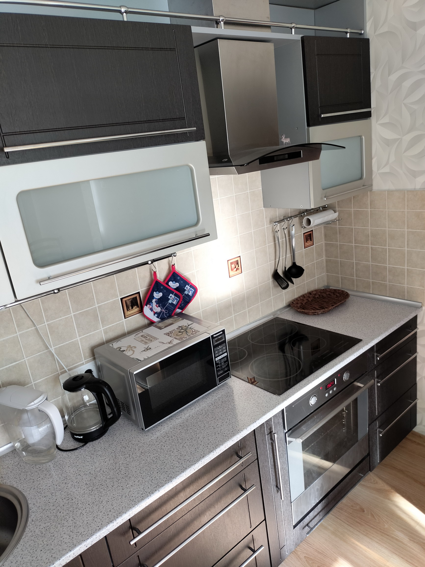 В квартире есть всё необходимое для проживания - мебель, посуда, техника: фен, утюг, гладильная доска тоже есть. Квартира чистая, светлая и просторная.