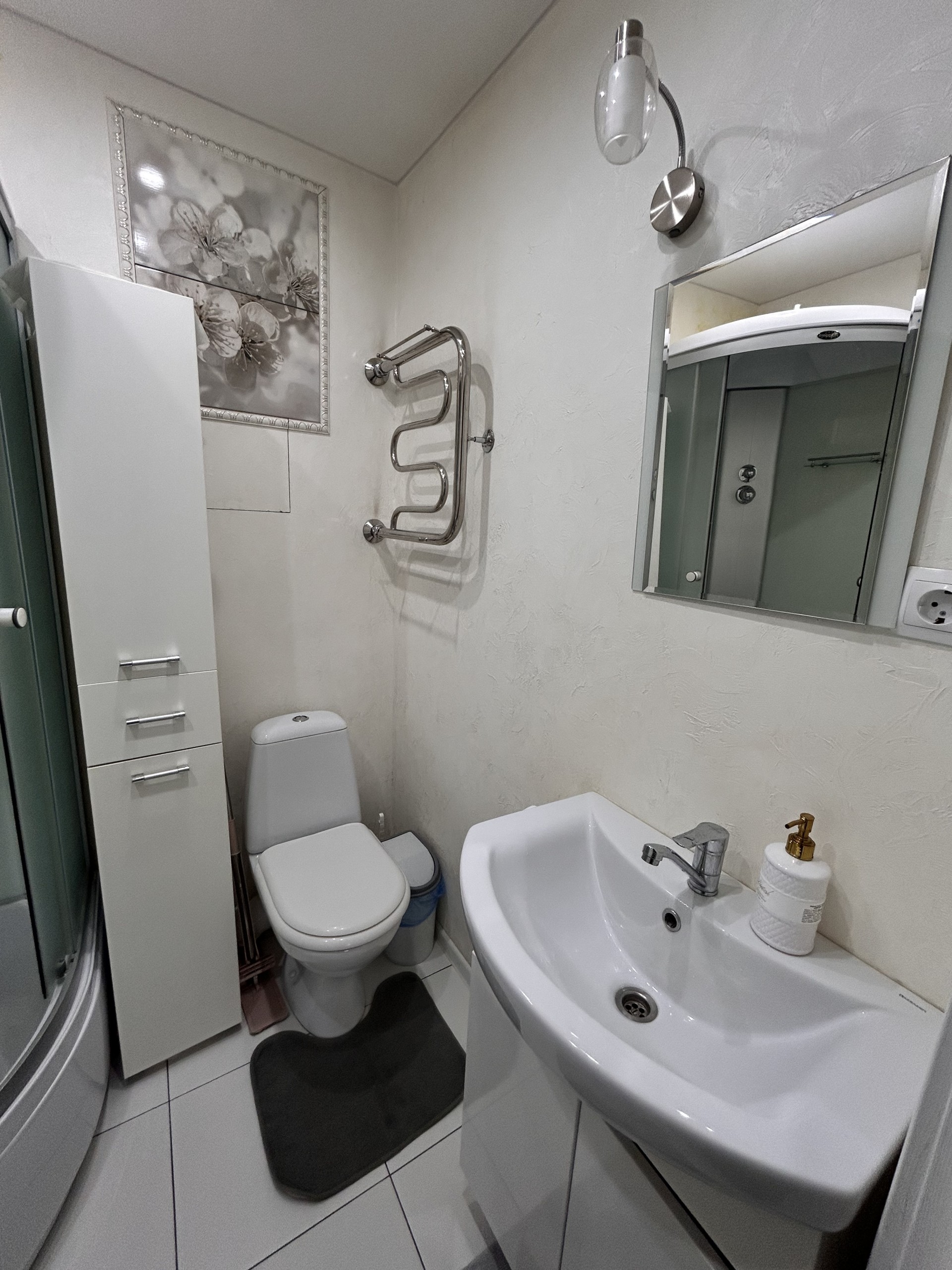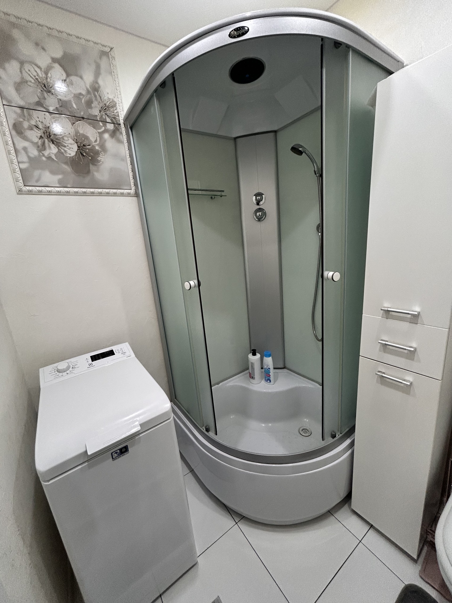 В санузле — просторная душевая кабина, гель для душа, шампунь, стиральная машина, фен, сушилка.