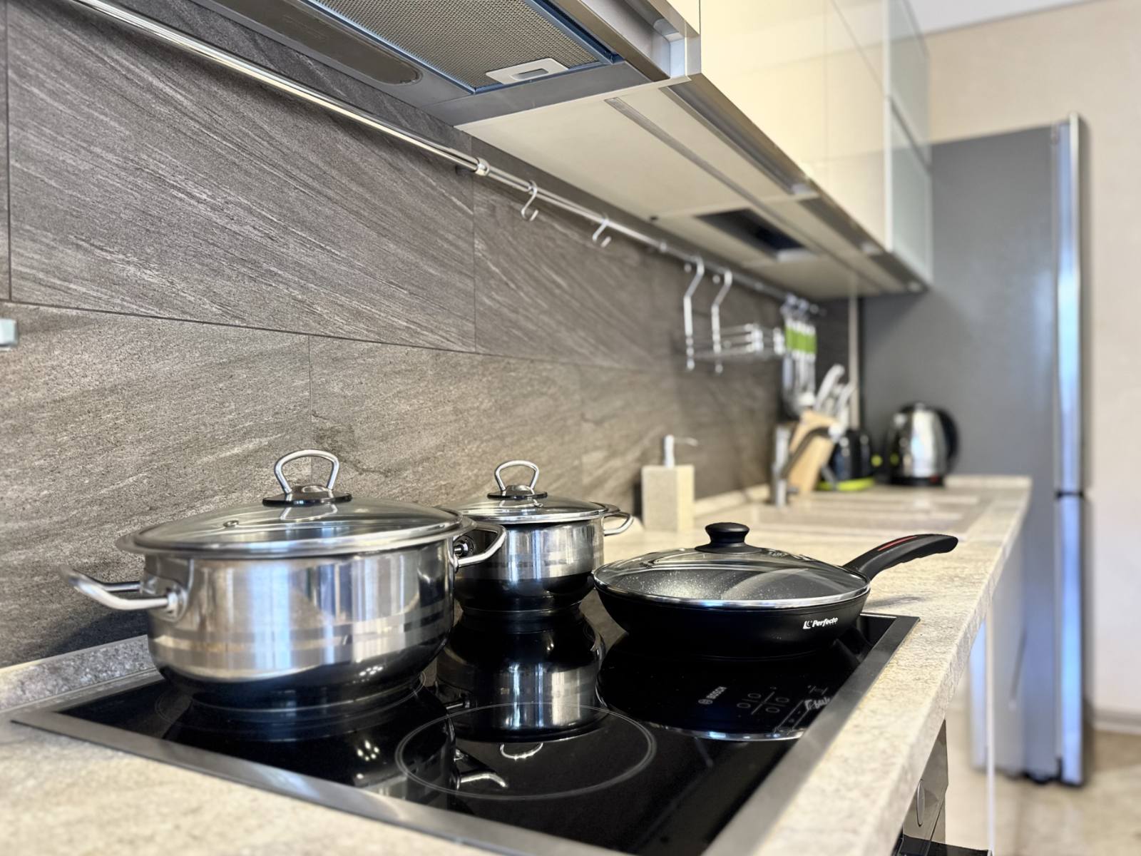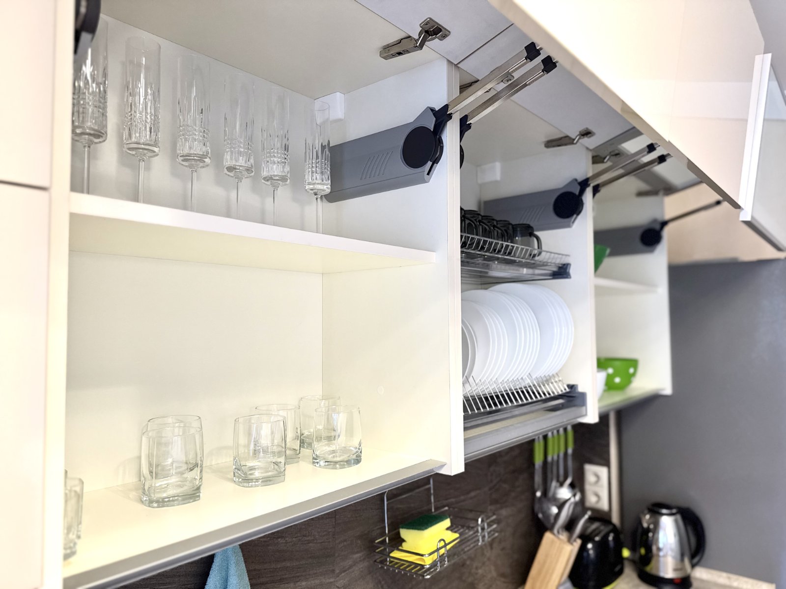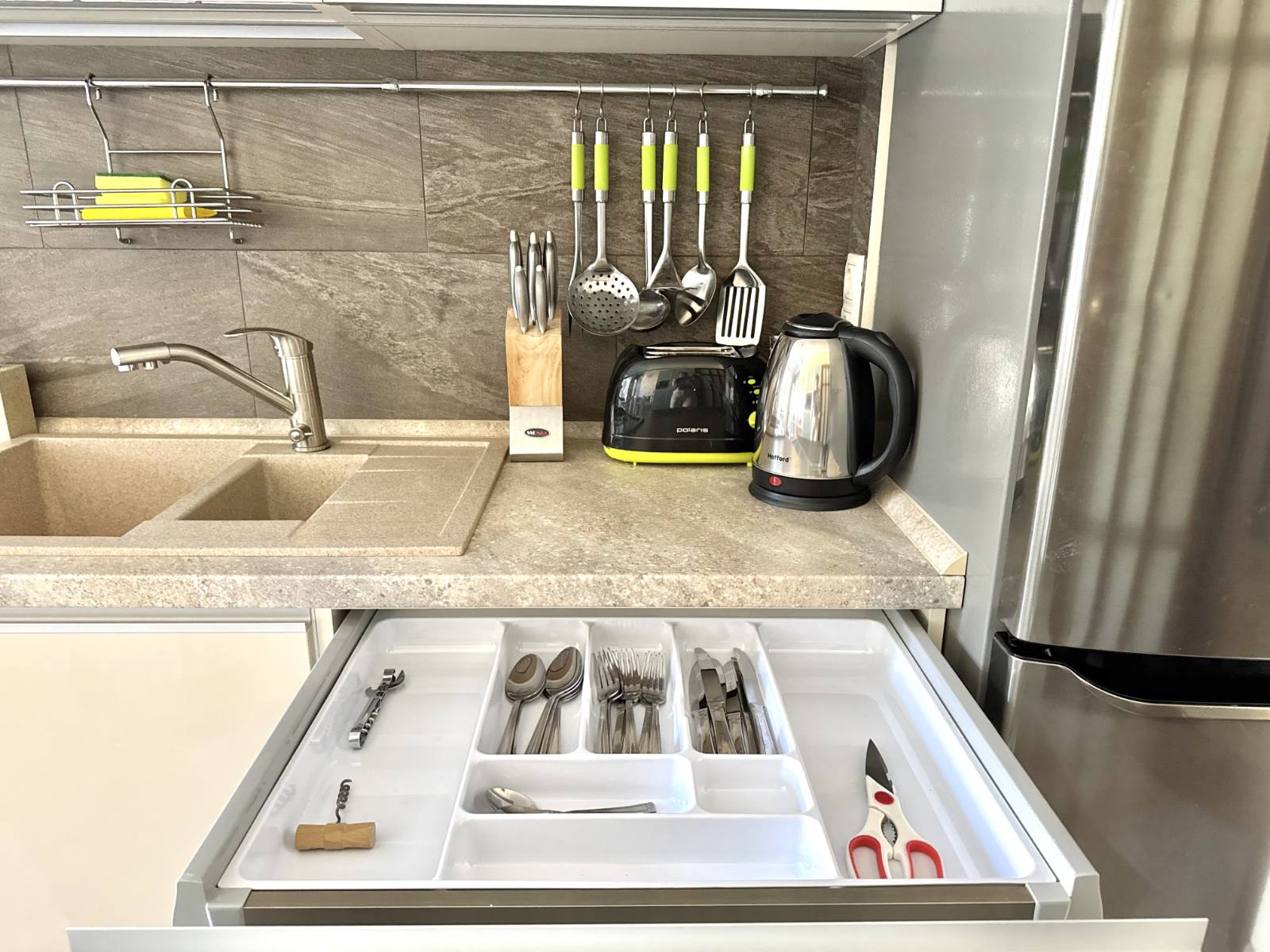 На кухне есть кофе, сахар, соль и подсолнечное масло. В кухонном шкафчике все необходимые столовые приборы